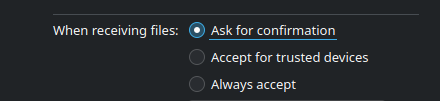 I have it configured to receive files from trusted devices automatically and yet it couldn’t receive the file I sent from my phone. Otherwise, I could send a file without any hassle.