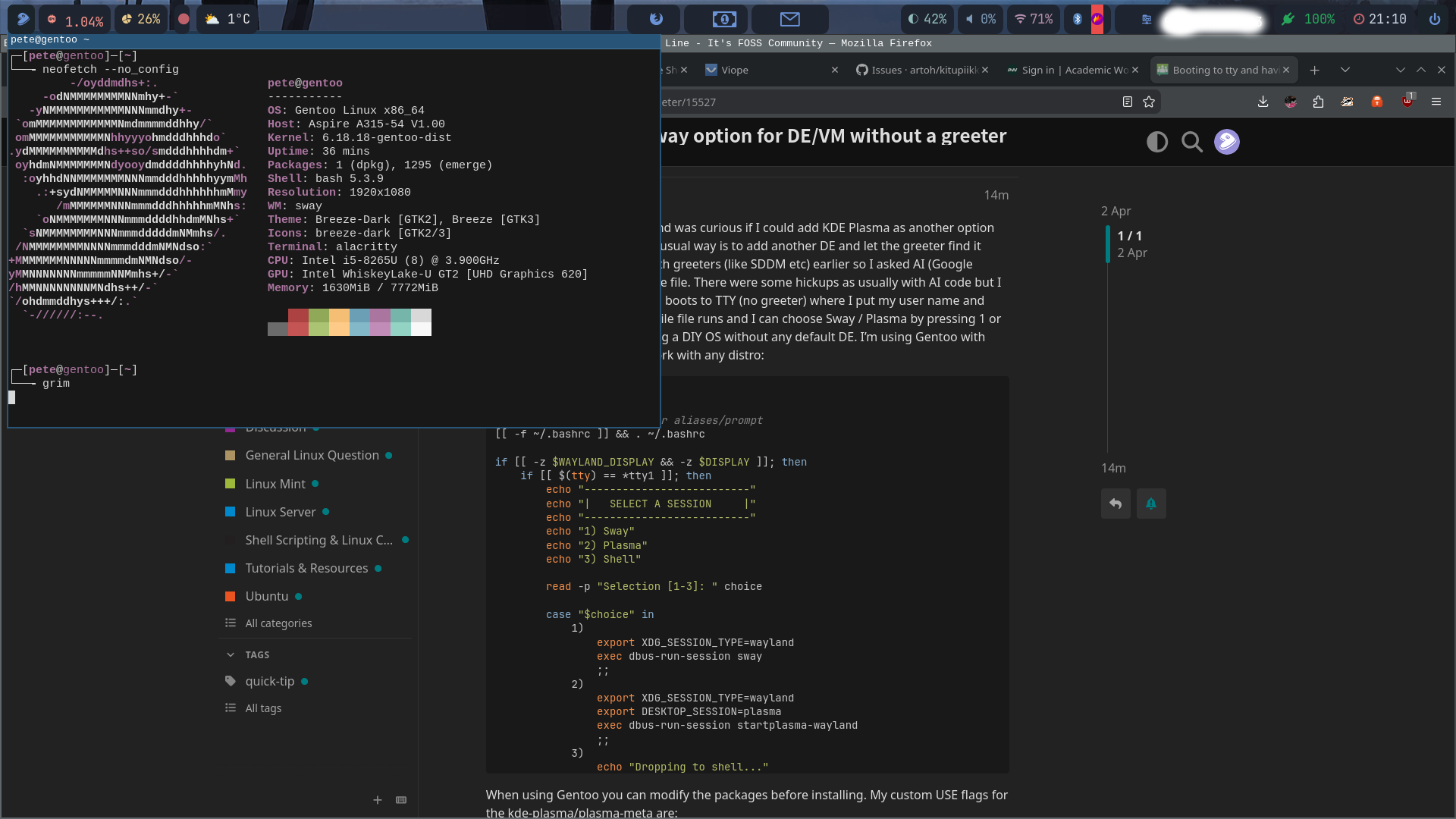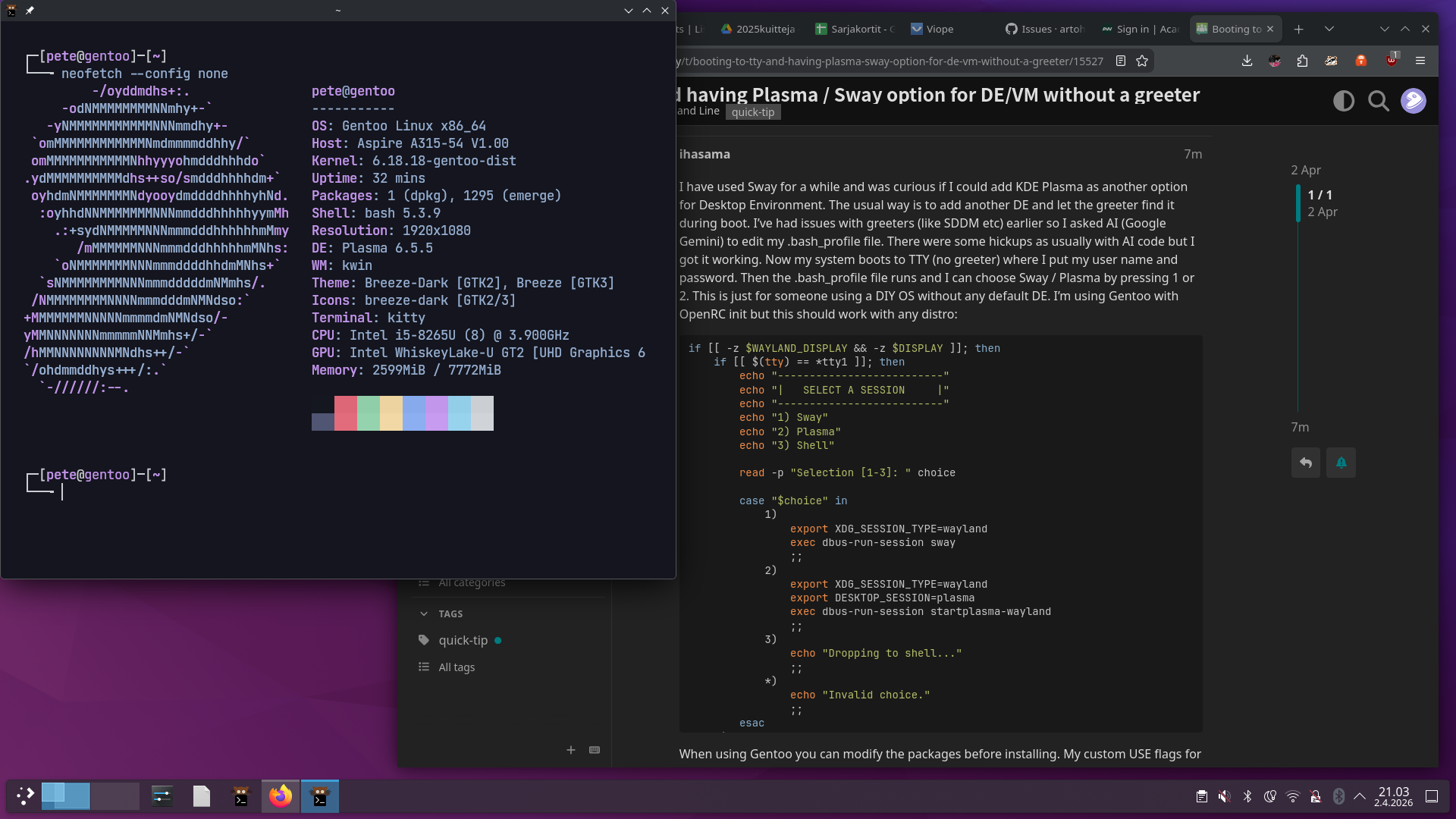 I have used Sway for a while and was curious if I could add KDE Plasma as another option for Desktop Environment. The usual way is to add another DE and let the greeter find it during boot. I’ve had issues with greeters (like SDDM etc) earlier so I asked AI (Google Gemini) to edit my .bash_profile file. There were some hickups as usually with AI code but I got it working. Now my system boots to TTY (no greeter) where I put my user name and password. Then the .bash_profile file runs and I can choose Sway / Plasma by pressing 1 or 2. This is just for someone using a DIY OS without any default DE. I’m using Gentoo with OpenRC init but this should work with any distro: