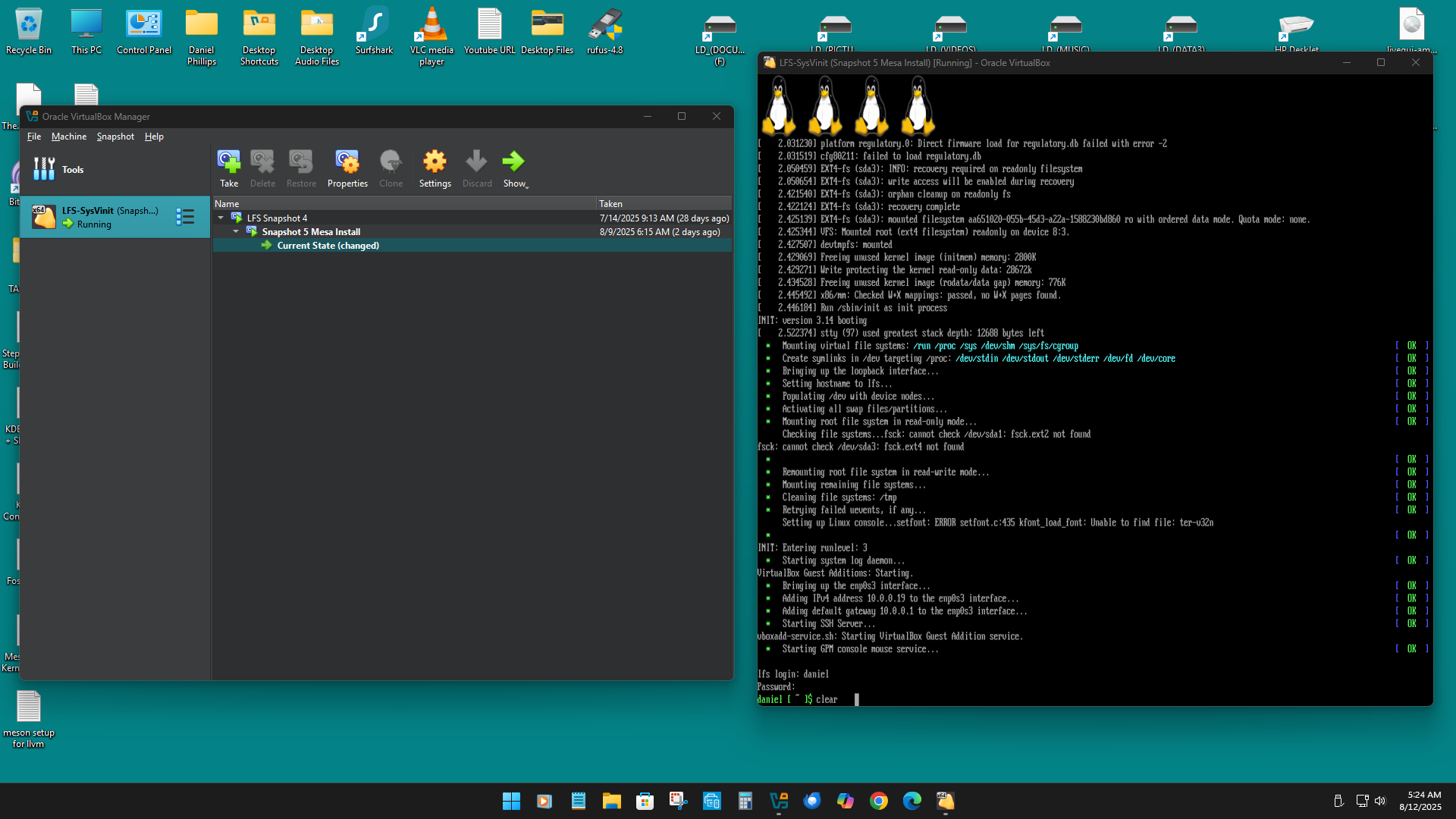 Am not using Vbox in Linux, am using Vbox in W11!!! Have LFS SysV booting with Vbox am now compiling LLVM and Mesa. LLvm compiles right at 4000 cmake CXX files, it takes a little time!!!