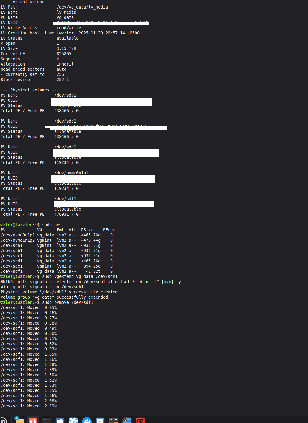 I managed to successfully merge my external USB drive’s capacity into my main IronWolf drive, making it part of my LVM /mnt/media family. I used the pvmove command in the terminal to seamlessly migrate all the data while the system was running.