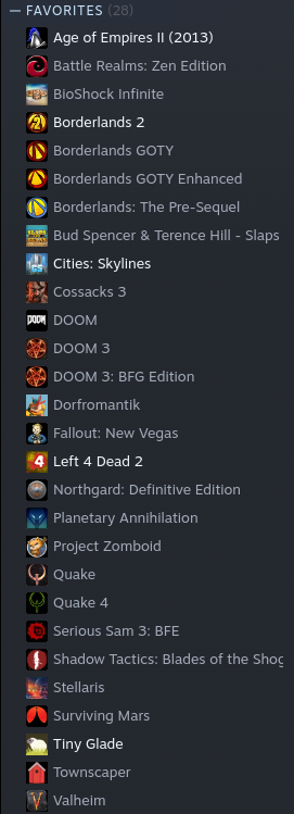 That’s probably about 1/3 of my whole Steam Games library - there’ve been a few I’ve taken a chance on but didn’t enjoy them, or they just got too damn hard to play… of that list of “Favourites” above - 7 of them are Windows only games (that I play on Linux) :