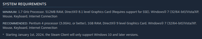 " ***** Starting January 1st, 2024, the Steam Client will only support Windows 10 and later versions."