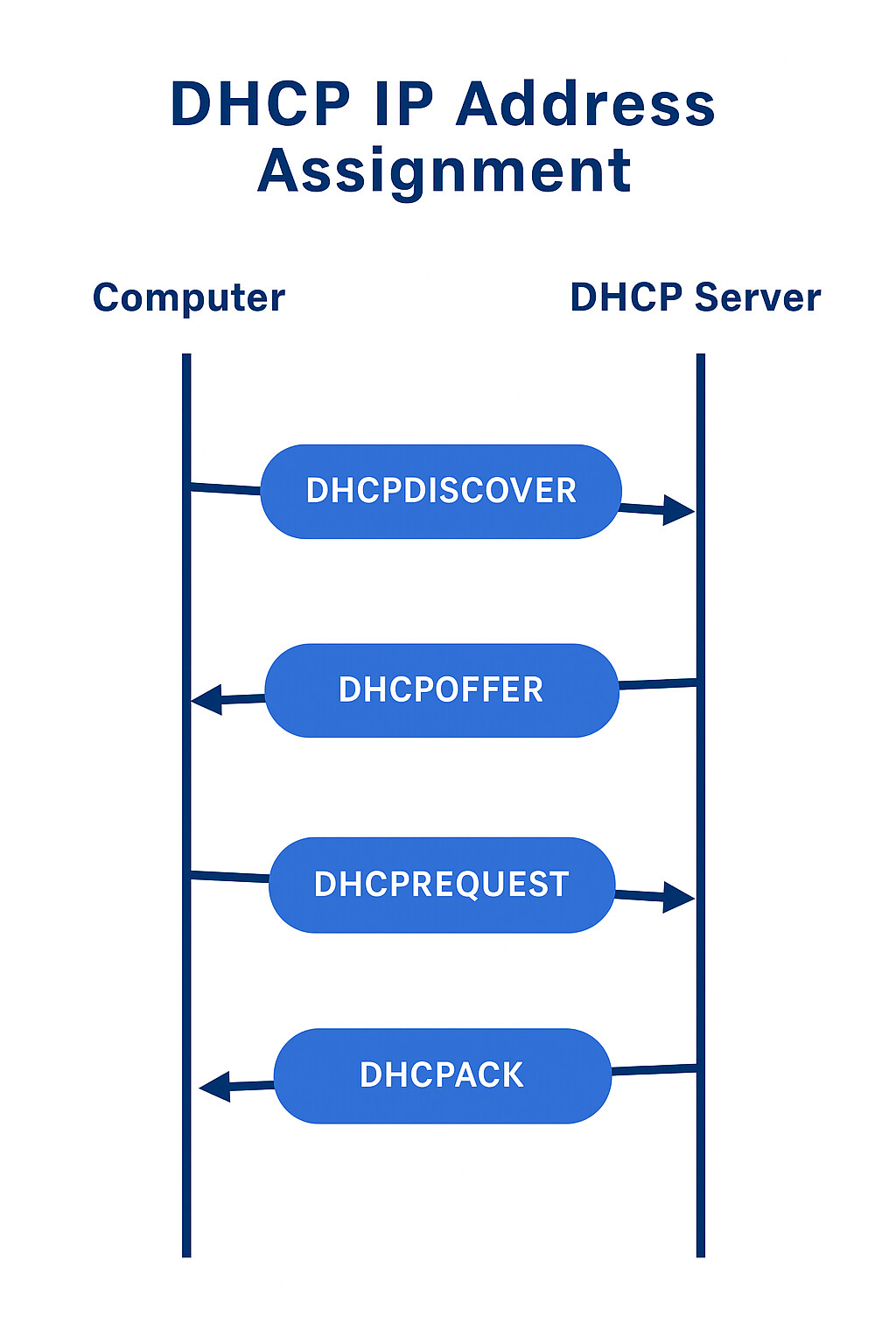 The DHCP diagram shows the four-step exchange: DHCPDISCOVER → DHCPOFFER → DHCPREQUEST → DHCPACK.