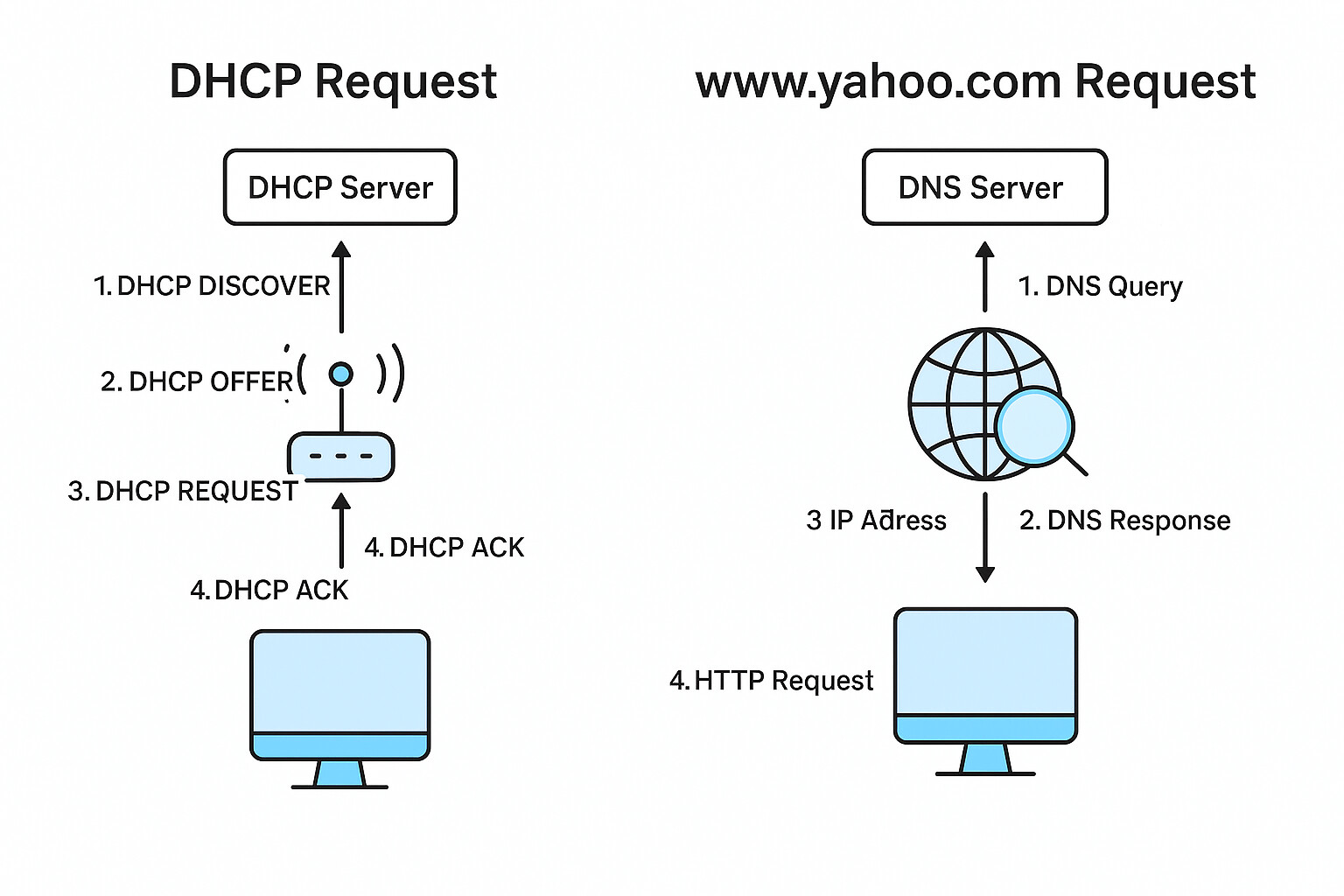 One illustrates the DHCP handshake (how your computer gets an IP address), and the other shows the DNS lookup flow (how your browser resolves www.yahoo.com into an IP before connecting).