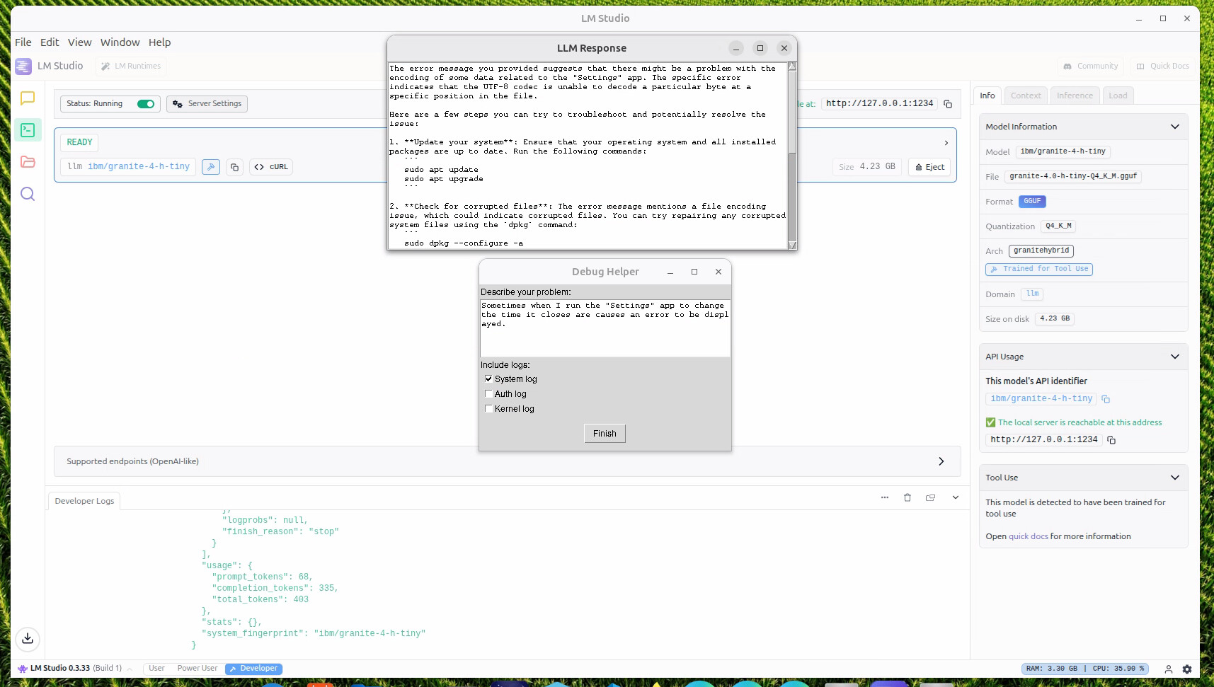 Ideally you could use any AI, and it could run locally. I thought I’d start by using LM Studio running on my own computer. I’ve been using the ibm/granite-4-h-tiny model. It’s pretty quick and light on resources but doesn’t seem quite as good with results as larger public models.