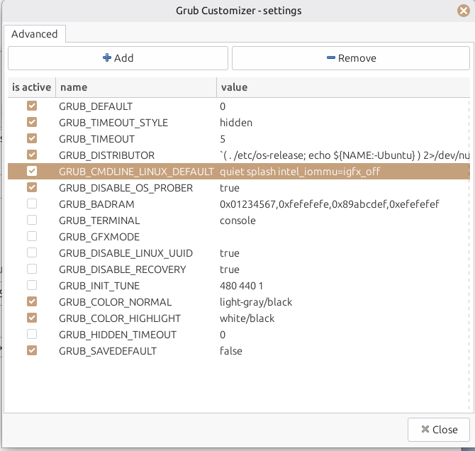 GRUB_CMDLINE_LINUX_DEFAULT=“quiet splash intel_iommu=igfx_off”