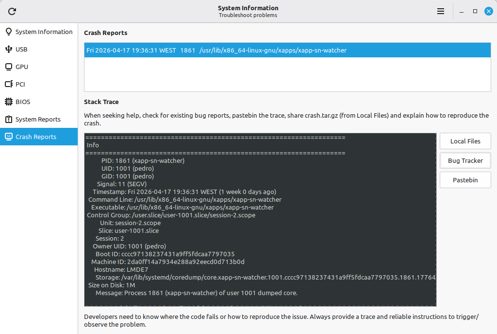 That’s a classic NULL/invalid pointer dereference inside a D‑Bus proxy call—almost certainly a bug in xapp-sn-watcher’s use of GIO, not your hardware or GPU drivers.