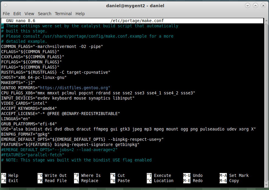 This is my “make.conf” for my Acer Mini PC!!! Notice, the make.conf is machine specific and this is the second step with Gentoo after the stage3 emerge.Now, I am old school and a self taught Gentoo user for over 10yrs now, and am still learning. You will see I have binaries enabled, but that is not done until I am in the CLI before emerging Xorg, and if the machine is capable. not even then!!! Why? because it slows an already slow machine!!!