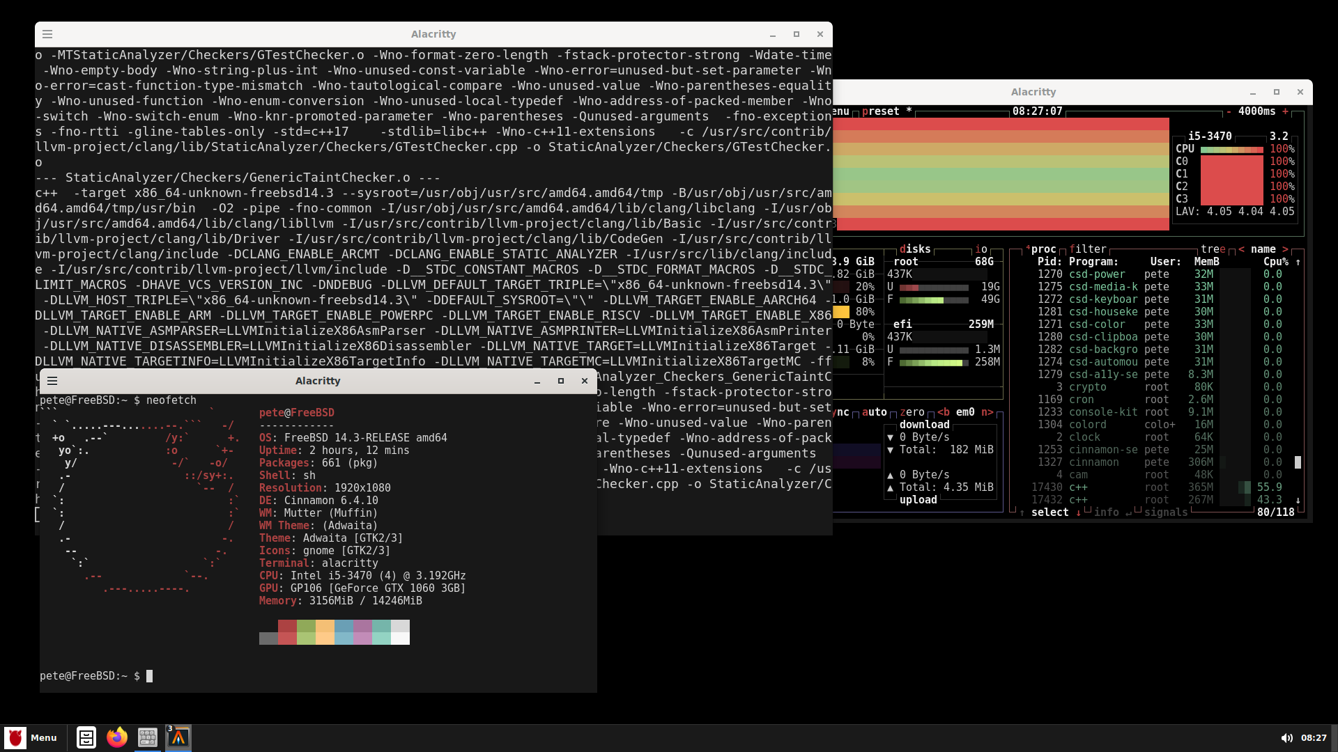 I couldn’t get FreeBSD (or the other BSDs) working properly inside Qemu. So I installed it to my HTPC’s SSD. I have X11 working and installing the Cinnamon desktop at the moment. It takes a while (LOL) because I use ports. There’s big packages to build. The difference with Portage is that you need to manually enable / disable what the package is building. So I need to monitor the build or otherwise it just waits for your input if you would like to build the docs or not with every package Cinnamon has as an dependency. Gentoo’s way is so much easier. I think we can close this thread and I’ll post a new one when my FreeBSD on hardware is working