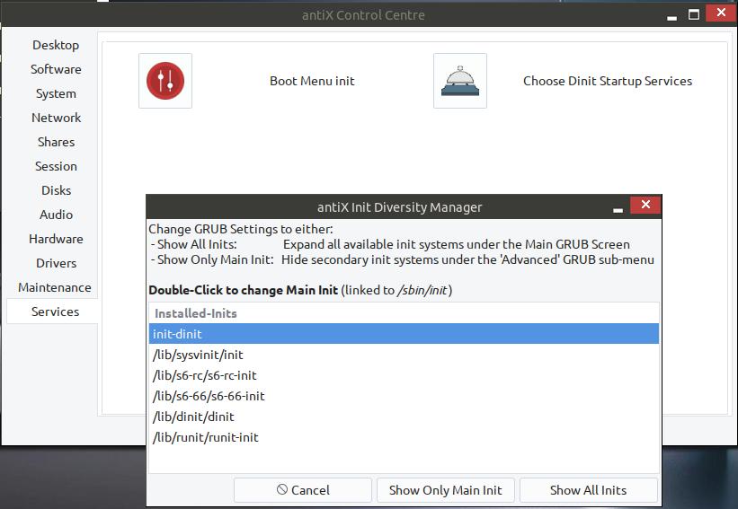 I could also have booted with the dinit option in the grub menu under Advance Options for AntiX. But I wanted the main menu item to be dinit not runit.