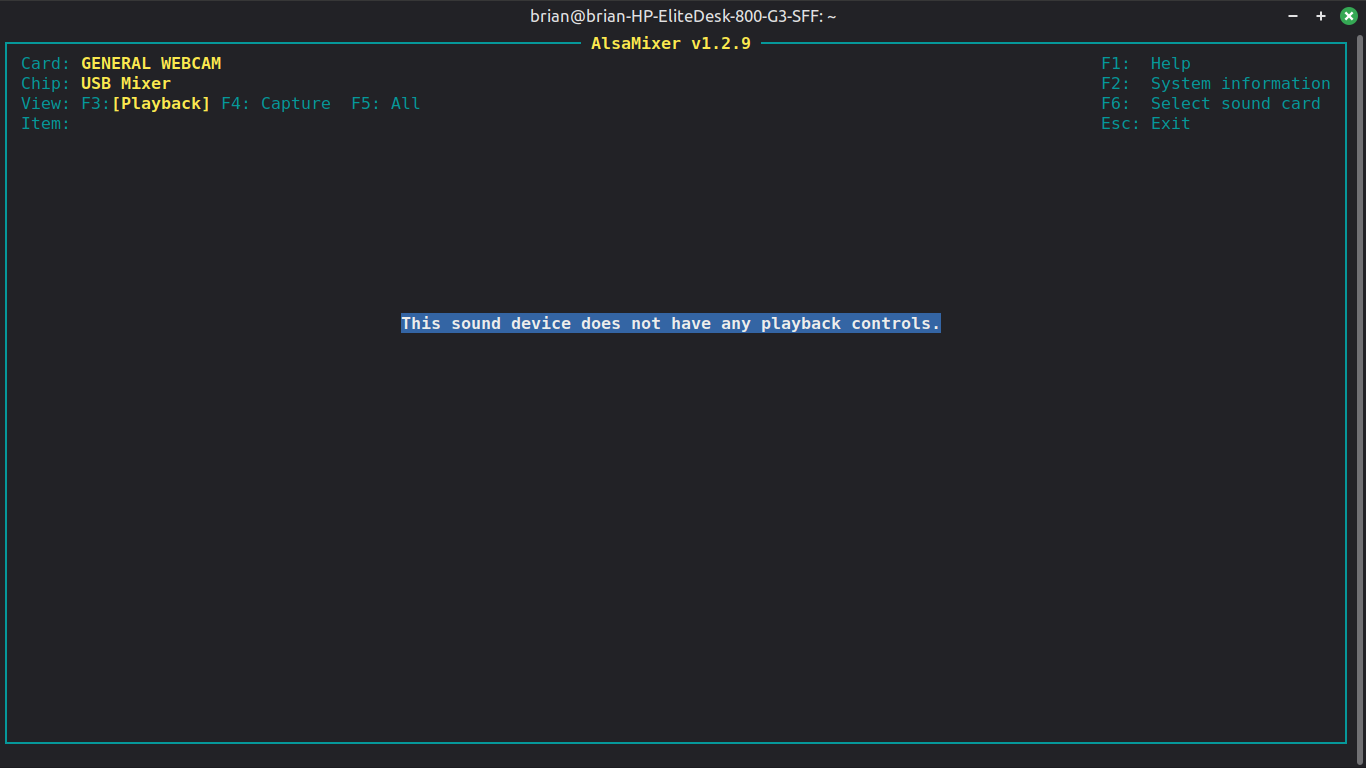 From what I can see, you don’t have MIC in alsamixer, which could mean that your webcam’s microphone isn’t being detected by the system.