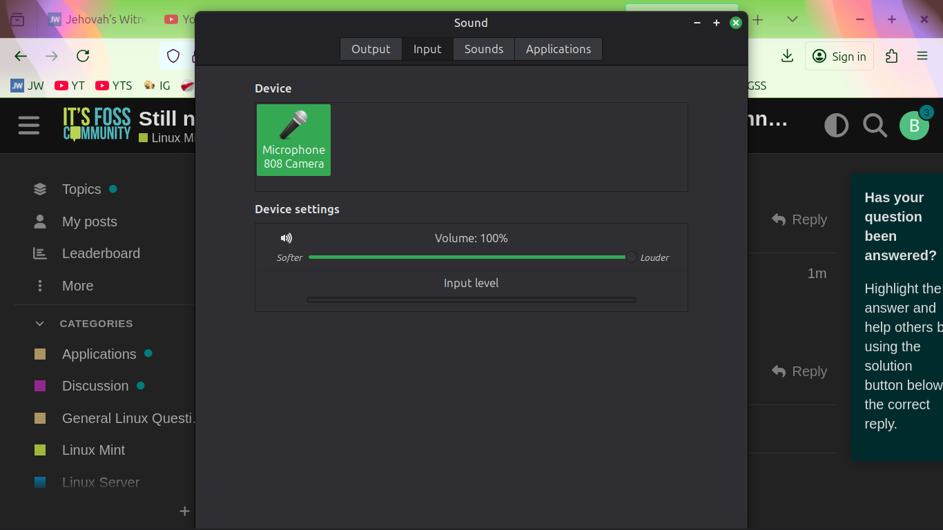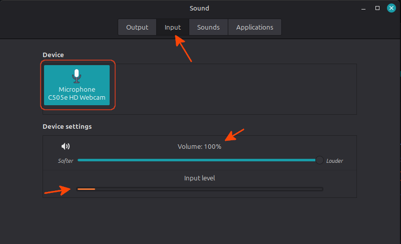 In the Sound window that opens, click the Input button and check that you have the Webcam Microphone device. If you do, check that the volume is at 100% and speak a little to see if the Input level bar changes: