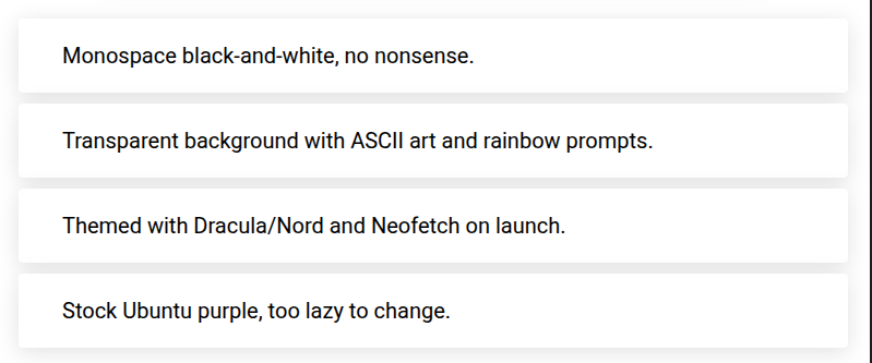 Because I have oh-my-zsh theming in my .zshrc and use zsh… But monospace black-and-white came closest - I don’t have any ascii art (except when I log in to one of my RPi devices - I have an /etc/motd)
