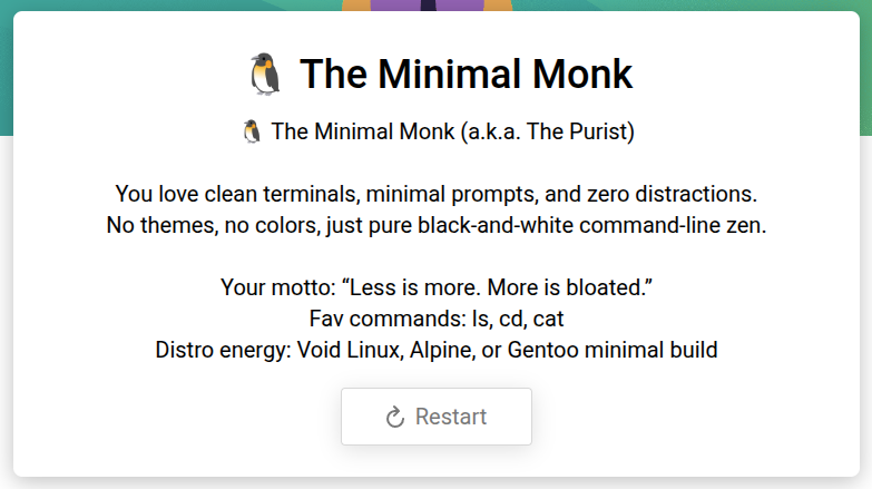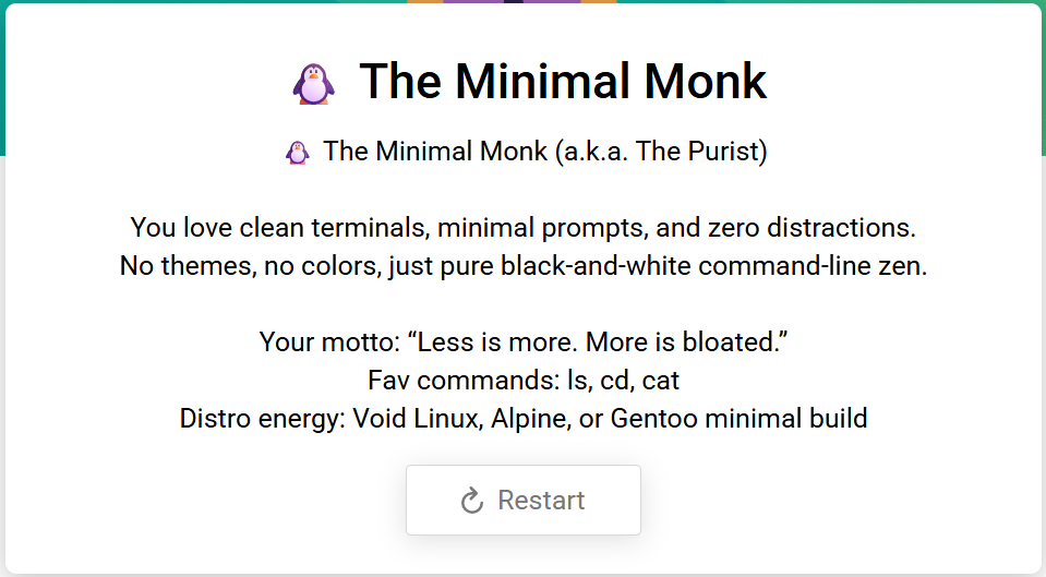 I got Minimal Monk too. Some of the questions do not offer any option that suits me…I had to choose closest approximation.
