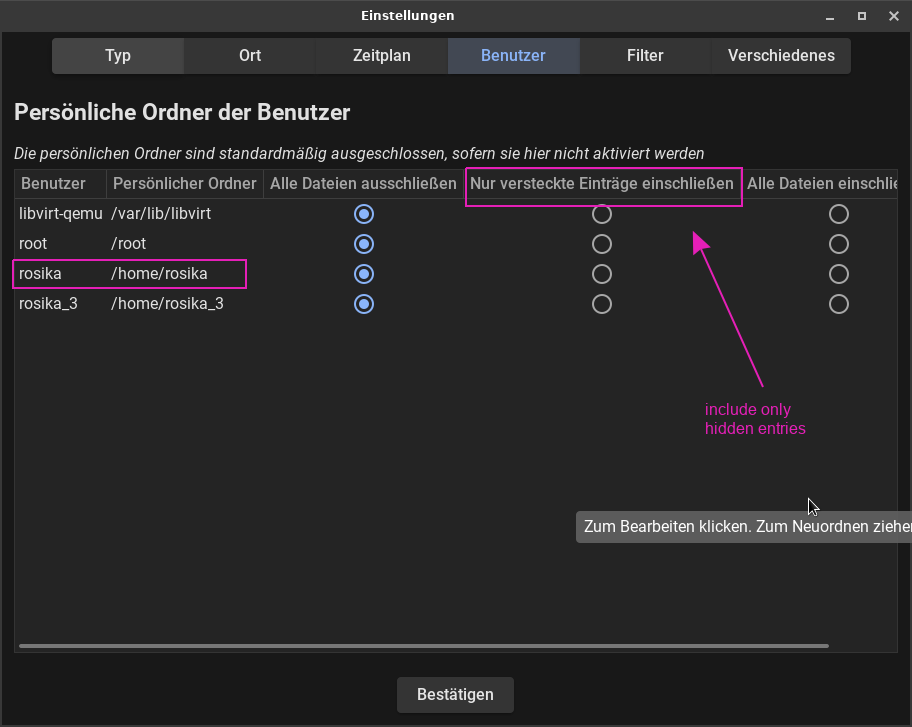 In the Filters tab, you can specify patterns to exclude other directories or files that you do not want to back up. For example, you can exclude all non-dot files or specific folders like Documents, Downloads, etc