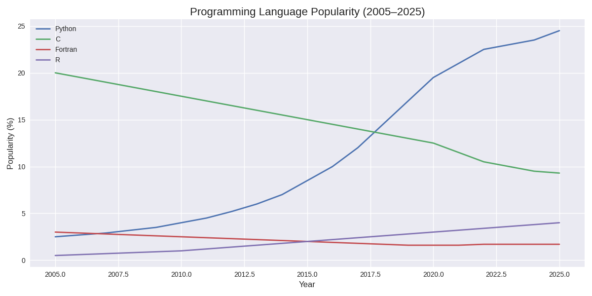 Here’s a snapshot of programming language trends from 2005 to 2025, based on simulated TIOBE Index data and corroborated by recent rankings2: