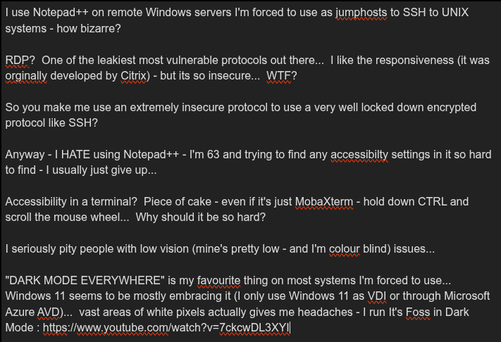 āDARK MODE EVERYWHEREā is my favourite thing on most systems Iām forced (nobody forced me to use Itās Foss!) to use⦠Windows 11 seems to be mostly embracing it (I only use Windows 11 as VDI or through Microsoft Azure AVD)⦠vast areas of white pixels actually gives me headaches - I run Itās Foss in Dark Mode :